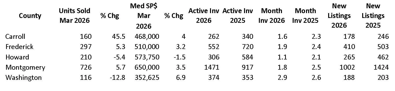 Stats within Maryland for March 2026 vs 2025 which saw $430,000 median SP$ increase 1.6%, pending sales grew from 6,319 to 6,870, active inventory dramatically fell from 16,294 to 12,762, new listings also declined from 9,482 to 7,145, closed sales fell from 5,097 to 4,874, months of supply fell to 2.3, and day on market is at 18.